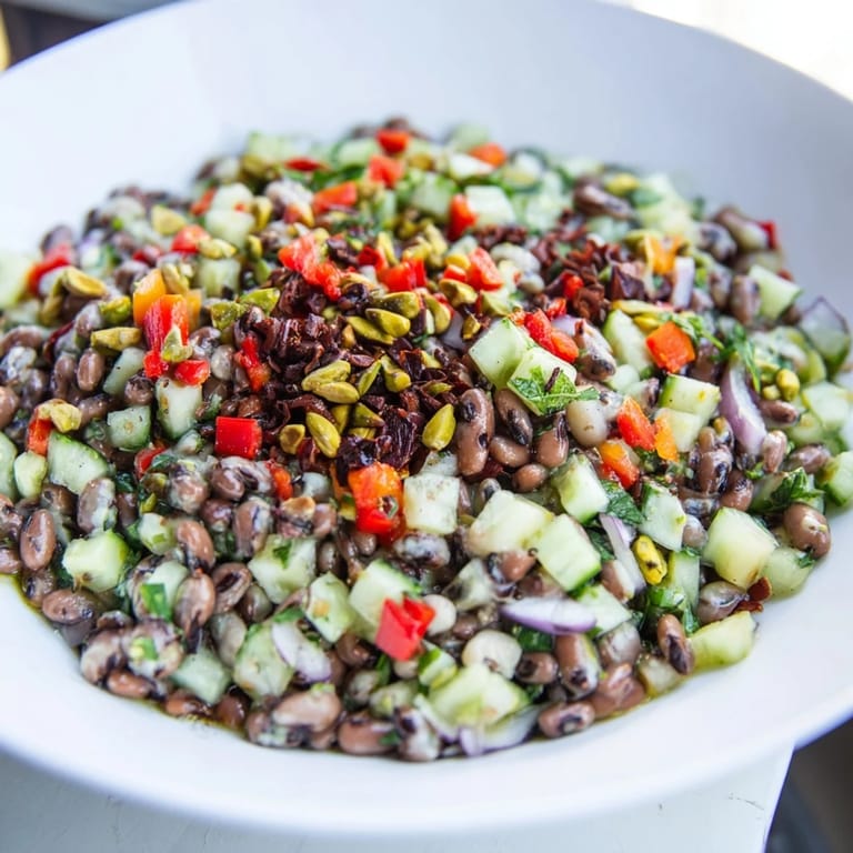 Save I stumbled onto this salad during a dusty afternoon in a shared kitchen, tired of the same bowls of plain beans. Someone had left a jar of pomegranate molasses on the counter, and I had pistachios from a market haul. The cacao nibs were a gamble, tossed in on a whim after reading about Dubai chocolate bars online. That first bite was startling: earthy, bright, just barely sweet, with a whisper of bitterness that made me sit up straighter.