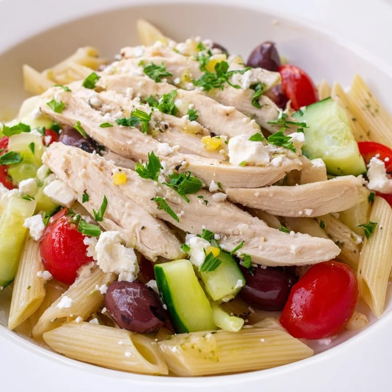 - Slice the rested chicken into thin strips and arrange it on top of the dressed pasta. Scatter the feta and fresh parsley over everything and serve while the chicken is still slightly warm against the cool pasta.