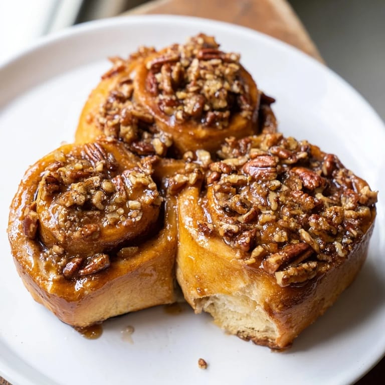 - Preheat oven to 350°F (175°C). Bake buns 28–32 minutes, until golden and cooked through. Let rest 5 minutes, then carefully invert onto a serving platter so glaze and pecans are on top.