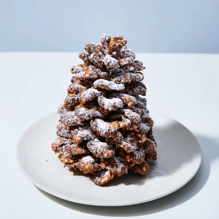 Save Whimsical, wintry treats featuring a creamy nut butter mixture shaped into pinecones and coated with crunchy cereals—perfect for festive snacking.