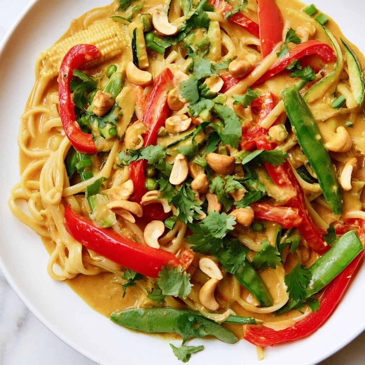 This dish welcomes experimentation in a way that feels generous. If you don't have snap peas, throw in broccoli or carrots; if your red pepper is tired, use what's bright and fresh. You can add cooked shrimp, chicken, or crumbled tofu if you want protein, or leave it vegetarian and let the coconut milk be the star.
