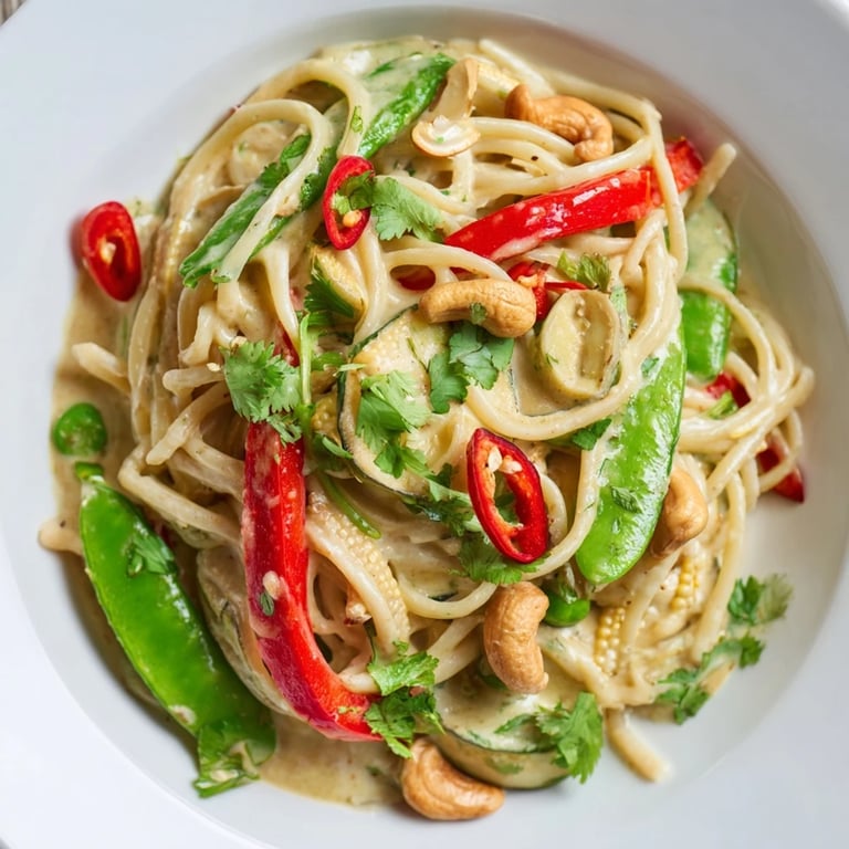 Save I discovered this dish on a rainy Tuesday when my freezer held only pasta and a jar of Thai green curry paste I'd bought on impulse months before. The kitchen smelled like coconut and garlic within minutes, and suddenly I was stirring silky sauce into linguine, watching vegetables turn tender-crisp in the heat. What started as improvisation became something I crave—that perfect collision of creamy, aromatic, and just spicy enough to make you feel alive.