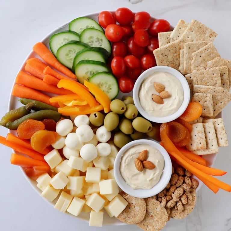 Whole grain crackers and roasted nuts provide satisfying crunch, balancing the fresh vegetables and creamy cheeses.